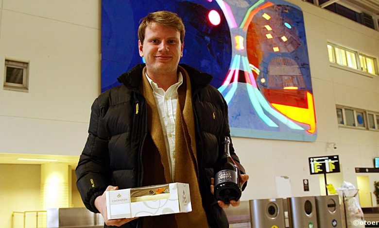 Efter at have gennemført sin rejse nummer 800 på 6 måneder fik Fredrik champagne og chokolade af SAS for at fejre rekorden.